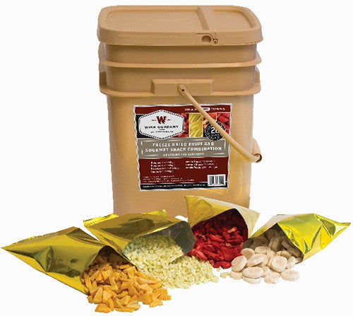Wise Company assorted freeze dried fruits are packaged in individual Mylar pouches, and then encased in durable plastic containers thus preserving food and eliminating waste.